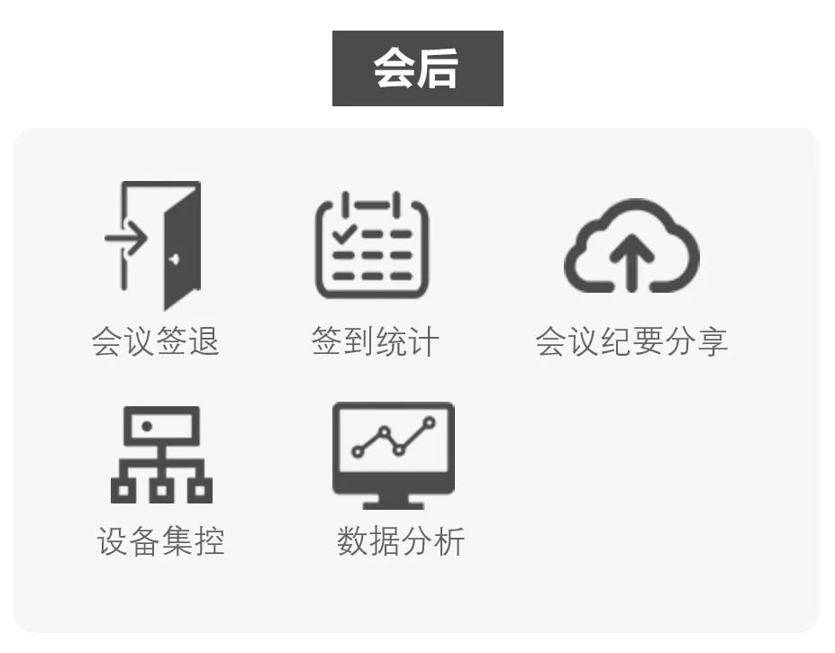 基于會前、會中、會后環節,通過可視化、智能化、物聯管控等技術,實現會議流程標準化、會議行為智能化、會議管理高效化。