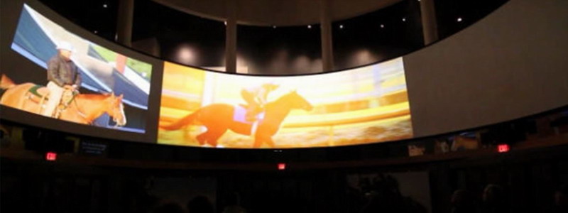 肯塔基賽馬博物館是肯塔基州路易斯維爾市的重要旅游景點(diǎn),館內(nèi)展示著一切有關(guān)肯塔基賽馬的展品。肯塔基賽馬被譽(yù)為“體育賽事中最激動(dòng)人心的兩分鐘”,賽馬博物館則將這令人心跳的兩分鐘搬進(jìn)了博物館的大廳,一遍遍地重現(xiàn)比賽畫面。博物館大廳呈橢圓形,如同賽馬場(chǎng)的跑道形狀,64米長(zhǎng)、3米高的360度屏幕環(huán)繞整個(gè)大廳。大屏幕主要用于播放名為“最偉大的賽事”的視頻。這部視頻早在1985年開始就一直在大屏幕上播放著,最早是以96張幻燈片的形式播放。從最初的多張幻燈片到現(xiàn)在的無縫超高清視頻,和博物館一直合作的兩家媒體設(shè)計(jì)團(tuán)隊(duì)居功至偉,它們分別是Donna Lawrence Productions制作公司(以下稱為DLP)和技術(shù)集成商Communications Electronic Design設(shè)計(jì)公司(以下稱為CED),這兩家公司也都在路易斯維爾市。2000年初,“最偉大的賽事”的視頻展示經(jīng)歷了重大的技術(shù)和多媒體升級(jí),采用了九臺(tái)松下投影機(jī),同時(shí)分辨率升級(jí)到720P高清,成為當(dāng)時(shí)全球第一個(gè)360度高清視頻展示。2009年,多媒體和投影系統(tǒng)再次升級(jí),采用九臺(tái)分辨率為1080P的投影機(jī),當(dāng)然,投影機(jī)依然沿用松下設(shè)備。