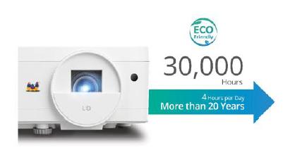 LS550WH提供30000小時(shí)光源壽命,每天使用 4小時(shí),用戶可使用超過(guò)20年,免于更換燈泡,同時(shí)對(duì)比燈泡投影機(jī)有更高的光效,更加節(jié)能環(huán)保,高壽命、低維護(hù)成本,為用戶保駕護(hù)航。