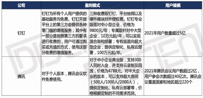 由于疫情影響,混合辦公開始在全球興起,主流的云會議軟件的用戶活躍量暴增,釘釘宣布其2021年的用戶總數(shù)量超過5億;騰訊發(fā)布數(shù)據(jù)2021年騰訊會議用戶數(shù)超過2億,用戶參會次數(shù)超過40億次;微軟截至2021年5月份 Microsoft Teams上線四周年用戶超1.45億;Zoom的用戶活躍數(shù)則是微軟Teams的兩倍多。那么軟件的用戶增速如此之快,云會議廠商的主要盈利模式是怎么樣的呢?筆者了解到主要盈利模式是軟件收費、平臺抽傭等,而釘釘是極少嘗試硬件模塊對外授權(quán)收費和銷售硬件產(chǎn)品的云會議廠商之一。盈利模式主要有以下幾個方面:1. 對于個人用戶,釘釘、騰訊、金山辦公、飛書等國內(nèi)會議軟件對個人用戶和小企業(yè)采取免費的策略;2. 對于中小型企業(yè)的專業(yè)版, 提供基礎(chǔ)服務(wù)和基本辦公;對于中大企業(yè)的專業(yè)版,根據(jù)企業(yè)成本,可提供產(chǎn)品靈活組合和行業(yè)集成方案;對于大型政府和金融機構(gòu),可定制核心功能,提供私有云,成本非常昂貴。專業(yè)版的價格從十萬到幾百萬不等。3. 騰訊會議、釘釘、Zoom、微軟Teams分別推出了各自的Rooms解決方案,Rooms是專為會議室打造的軟件系統(tǒng),提供音視頻會議、共享屏幕、觸屏式白板的集成會議體驗,開放音視頻認(rèn)證標(biāo)準(zhǔn),和視頻會議硬件品牌合作,軟硬結(jié)合共同為企業(yè)提供現(xiàn)代化的會議室解決方案。值得一提的是, 釘釘在提供會議軟件的同時,也嘗試發(fā)布視頻會議硬件產(chǎn)品如音視頻會議一體機,可搭配TV、FPD、IFPD等顯示器使用,并與硬件廠商合作共贏,對硬件廠商開放了釘釘?shù)囊粢曨l模塊、技術(shù)和算法等。