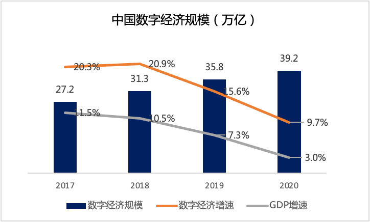 中國信息通信研究院發(fā)布的數(shù)據(jù)顯示數(shù)字經(jīng)濟在疫情影響下加速發(fā)展,2020年我國數(shù)字經(jīng)濟規(guī)模達(dá)到39.2萬億元,較上年增加3.3萬億元,占GDP比重為38.6%,同比提升2.4%,有效支撐疫情防控和經(jīng)濟社會發(fā)展。在線辦公、在線教學(xué)、在線醫(yī)療等數(shù)字化、新業(yè)態(tài)、新模式在疫情影響下不斷涌現(xiàn),大量企業(yè)利用5G、AI、大數(shù)據(jù)等加強供需精準(zhǔn)對接、高效協(xié)作和高效生產(chǎn)。