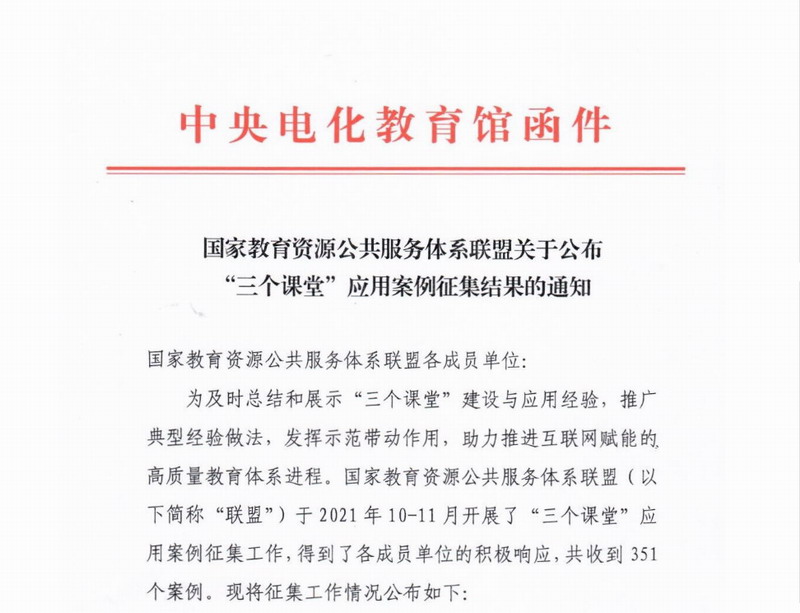 中央電化教育館為及時總結和展示“三個課堂”的建設與應用經驗,實行推廣典型經驗做法,發揮領頭示范帶動作用,從而助力推進互聯網賦能的高質量教育體系進程。國家教育資源公共服務體系聯盟,于2021年10月至11月,開展了“三個課堂”應用案例征集工作。