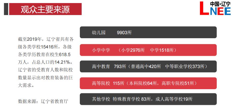 為貫徹落實教育部、國家發改委、財政部聯合發布《關于切實做好義務教育薄弱環節改善與能力提升工作的意見》和加快推進《中國教育現代化2035》實施方案,為加快推進東北教育現代化,建設社會主義學習大國、人才強國,2022遼寧教育裝備展覽會6月17-19日在沈陽國際展覽中心順勢而辦,為推動東北地區教育事業發展搭建了交流互鑒的平臺。圍繞鞏固“全面改薄”工作成果,全面提升義務教育學校辦學水平以打造“教育現代化與科技進步相融合的新平臺”為愿景,旨在引進國內外高新裝備技術,為教育體系建設提供切實可行的管理升級和教學系統解決方案。l 展覽會以義務教育薄弱環節改善與能力提升工作“振興東北,教育先行 ”為主題,推動東北地區教育事業持續健康快速發展。本屆展會定位‘國際化、品牌化、專業化’,集“新品展示+精準對接+論壇研討+場景體驗”四位一體,匯集全球知名教育產品品牌。