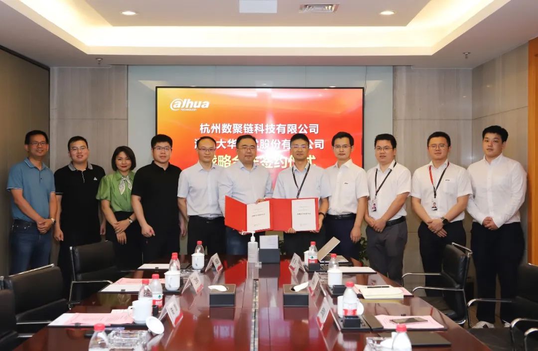 近日,大華股份與杭州數聚鏈科技有限公司(以下簡稱數聚鏈科技)簽署戰略合作協議。雙方圍繞區塊鏈、人工智能、物聯網、大數據等技術在智慧海關等領域的創新融合應用方面開展全方位合作,實現優勢互補,協同發展。數聚鏈科技董事長陸劍,大華股份副總裁張軍昌等雙方領導出席簽約儀式。