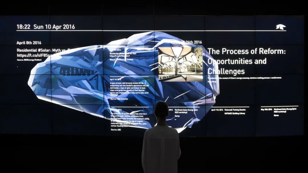 在中庭2層的視頻墻上,FIELD(藝術設計公司)被邀請用藝術隱喻表達KAPSARC的目標和愿景——共同合作,探索自然。