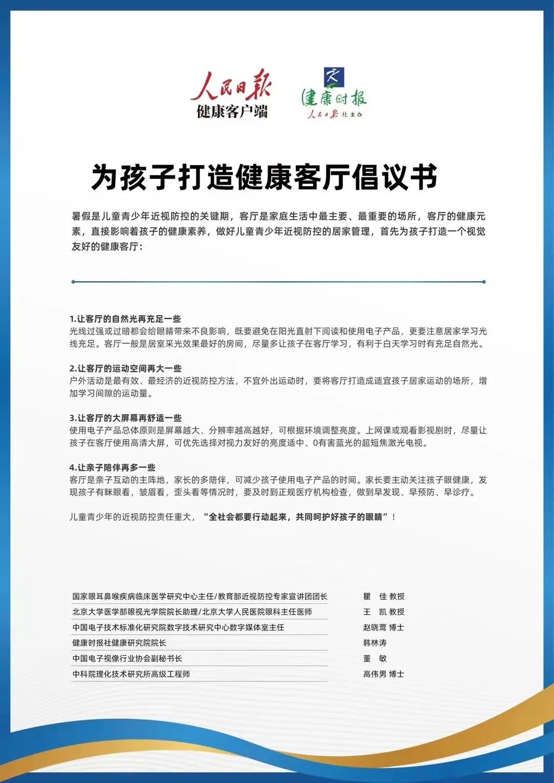為引導(dǎo)兒童青少年合理使用電子產(chǎn)品,做好近視防控工作,中國電子視像行業(yè)協(xié)會、人民日報健康客戶端、健康時報聯(lián)合論壇參與專家,發(fā)起《為孩子打造健康客廳》倡議書,呼吁家庭重視客廳健康。倡議書呼吁:為孩子打造光線充足亮度適中、適宜居家運動、更多親子互動和陪伴的客廳;在客廳電子設(shè)備的選擇上,倡議依據(jù)觀看距離選擇大尺寸、高清、亮度適中的視力友好大屏,可優(yōu)先選擇0有害藍光的超短焦激光電視。