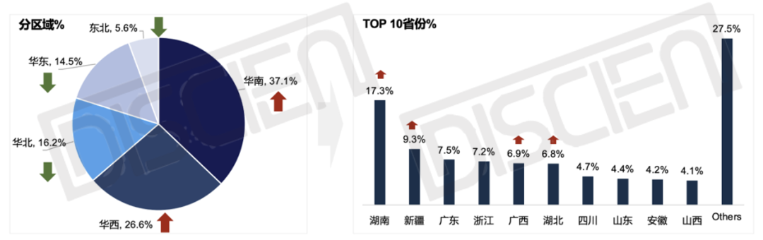 從中標項目數量分布來看,華南&華西同比增長較為明顯,合計份額超60%;分省份來看,TOP3省份分別為湖南、新疆、廣東,合計占比接近35%,同時從TOP3省份的項目特點來看,主要以教育(職業教育&義務教育)、公安、醫療衛生為主。