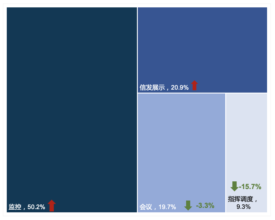 從中標項目的應用分布來看,液晶拼接主流以監控及信發展示為主,合計份額超7成且占比仍保持增長;指揮調度應用受到競品LED小間距的替代趨勢較為明顯,占比已低于10%;會議應用占比略有下降,該應用下用戶預算差距較大。