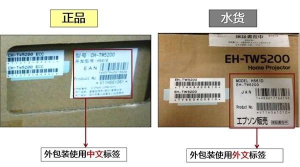 首先,一眼可識別的就是投影機的外包裝,愛普生正品投影機包裝盒上使用的中文標簽,而所謂的水貨所用的是外文標簽。