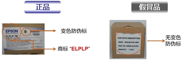 不僅是投影機,燈泡辨真?zhèn)瓮瑯又匾燮丈窡襞莅b盒上都會有變色防偽標, 同時,正品的愛普生LOGO下方都會有商標“ELPLP”字樣,如無以上防偽標識,則為假冒品。