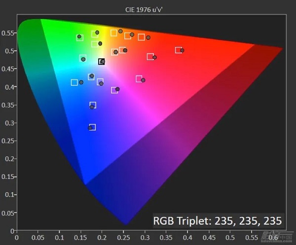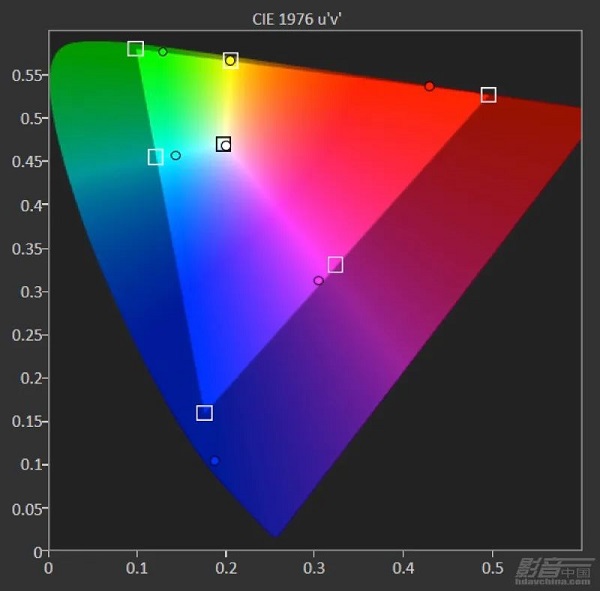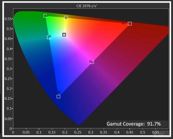 影院模式,4K HDR測試信號下,色域覆蓋范圍超過80% DCI-P3,白點接近于D65