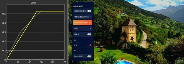 在EH-LS800B之中,我們發現了專門針對HDR影像優化的場景自適應Gamma功能,可以根據畫面不同場景的亮度變化自動調整Gamma(EOTF)曲線,適當的開啟可以有效提亮畫面暗部亮度,增加暗部的細節層次。