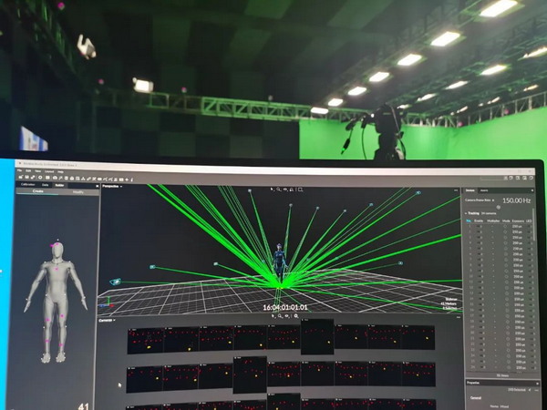 我們通過現場架設的34 臺Optitrack 動捕攝像機,運用 Motive3.0 軟件對動捕演員的身體動作進行識別、分析,形成骨骼數據,并將骨骼數據流傳輸至 Motionbuilder,實時驅動數字主持人“小漾”,為其注入活力,模擬完成主持人全部工作。同時配合節目組進行與主持人間的對位,保障動捕系統與 AR 實時渲染端系統的正常對接、現場多系統間的時碼同步,確保節目順利進行。