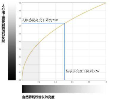 例如,肉眼看一塊實際亮度為1000nit的LED顯示屏,我們把亮度降低到500nit,實際亮度降低了50%,但是肉眼感知亮度不是線性下降到了50%,而是感覺僅僅下降到73%。