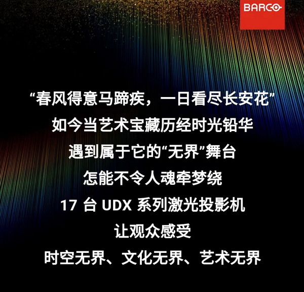當(dāng)多種技術(shù)手段在舞臺(tái)中融合,每一個(gè)畫面都在舞臺(tái)技術(shù)和視覺效果中不斷變化與重建。在影像呈現(xiàn)方面,對(duì)投影機(jī)有很高的要求。巴可 UDX 系列激光投影機(jī)擁有業(yè)內(nèi)范圍最廣的色譜空間,超過了 Rec.709 色域標(biāo)準(zhǔn),精準(zhǔn)還原了“長(zhǎng)安月下,美人如夢(mèng)。宮闕殿中,意氣如虹”的盛唐繁華、“多元文明、萬象繽紛、交流互鑒”的幻影世界.......
