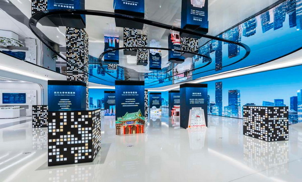 在展廳中庭,高清LED立柱四面屏、弧形屏和展廳內部空間構造相得益彰,以數字化方式生動地再現了華為在智慧醫療、智慧教育等領域的落地應用及實踐成果,極具視覺沖擊力,也讓整個展廳更具科技感、互動性。