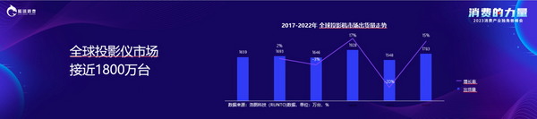 2017年-2022年,全球投影儀市場出貨量沒有太大變化,除了2021年有所下滑,其他時間都是比較平穩的。洛圖數據預測到2023年全球出貨量將會達1800萬臺。