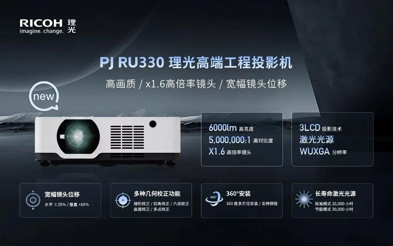2023年3月份,理光率先打響國際大牌年度新品戰的第一槍:入門工程并兼容高端商教應用的RU330、RU336ST兩款機型在順利首發。RU330、RU336ST兩款機型采用3LCD投影技術、擁有WUXGA分辨率、配備激光長壽命光源,并擁有ISO亮度6000/5500流明(中心亮度6400/5950流明)的高亮度。