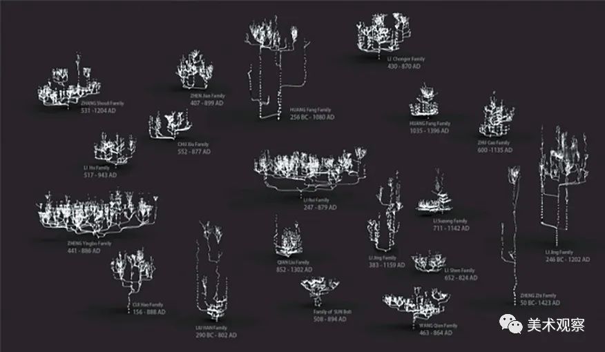 以《中國古代人物家族樹》作品為例,將古代文獻中的家族關系連接、判斷,并按時間順序構成動態家族圖譜脈絡,以此脈絡為基礎的展覽可以讓觀眾打破傳統的“儀式性”,可以自主地選擇從不同空間角度凝視家族數據樹的生長、主干和枝干的關系,向大眾呈現中國歷史上出現的“一子多父”等矛盾的血脈關系問題,更是演繹出中國古代血脈跨越歷史的興衰更迭變化。