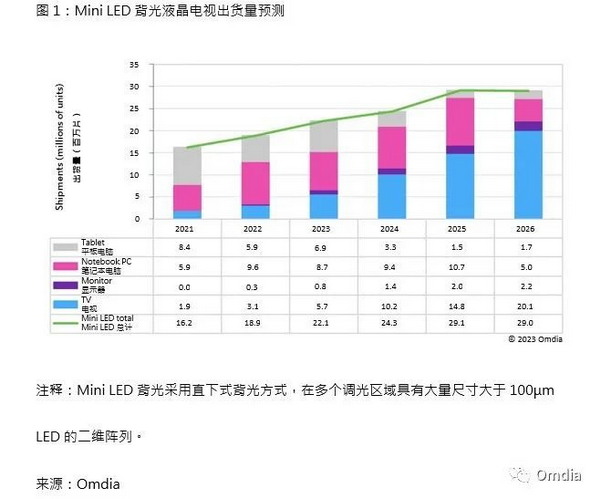 據Omdia 研究報告,2022年 Mini LED 背光液晶電視出貨總量預計為300萬臺,低于 Omdia 之前的預測。Omdia 對2023年的出貨量預測也進行了下調。