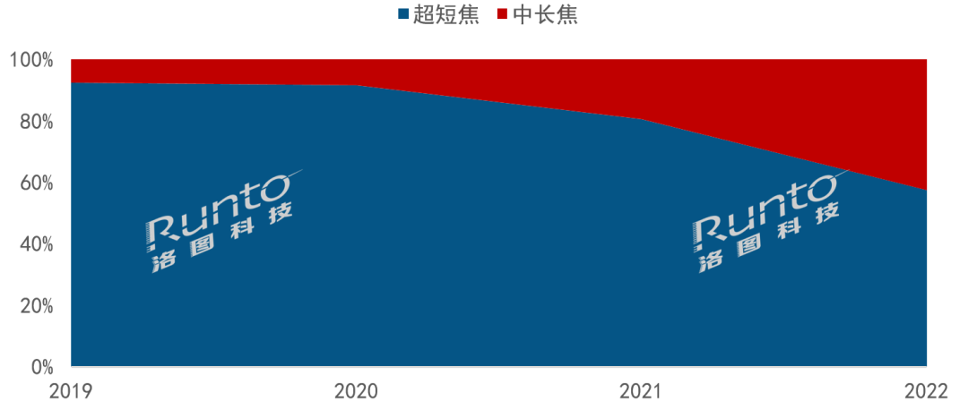 2022年,家用激光投影市場在鏡頭技術結構上出現明顯變化。超短焦與中長焦技術的出貨量比例從2021年的81:19變為2022年的57:43。