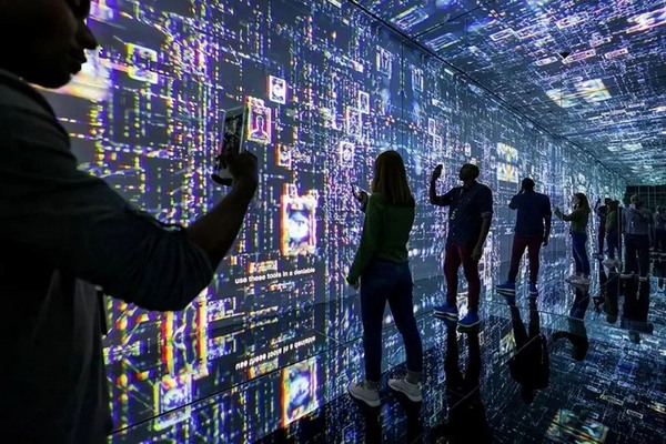 以世界上最大的沉浸式數(shù)字藝術(shù)展——光之博物館為例。該藝術(shù)展一共囊括了136臺(tái)投影儀,3300平方米的總投影面積以及50K像素、2千萬(wàn)行文本,是世界范圍內(nèi)體量宏大的人工智能展之一。