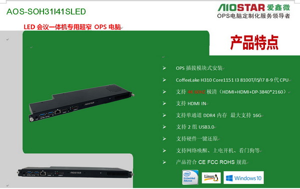 2021年初愛鑫微電腦針對LED會議一體機聯合雷曼光電、科侖特、洲明、阿爾泰、聯建、奧拓、艾比森、九洲光電、長春希達、三思、兆光光電、泰亨光電、德賽光電、京東方等LED廠家推出了一款行業標準規范的超窄.超薄.超性能的LED行業級OPS電腦,解決傳屏LED會議一體機單安卓系統的升級方案,可以快速實現android+windows雙系統方案的落地,此款LED行業級OPS插拔式電腦的主板采用intel H310芯片支持8-9代4核/6核/8核心I3/I5 9400/I7 9700/至強CPU,支持多路HDMI輸出顯示(支持多屏顯示),支持一路視頻會議的HDMI IN,同時可以支持WIFI6的無線網口,如此高性能的LED行業OPS電腦可以滿足LED行業高端客戶對不同產品的定制需求。