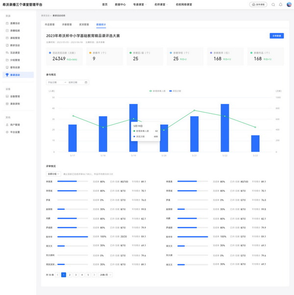 從創建比賽、選手報名、作品收集,到評委評分、結果公布,比賽的全進程都可靈活掌控、高效推進。足不出戶隨時看課評課,評分數據自動統計匯總,評審進度和結果全程可追溯 ,獲獎作品還可常態化供區域教師觀摩學習。發掘潛力教師,沉淀優質資源——“千里馬”和“伯樂”都不該難尋覓、難挖掘。