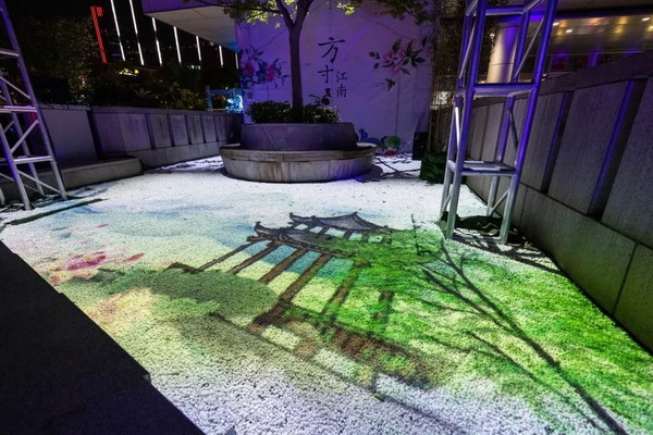 沉浸式光影微秀《方寸江南-山塘六感》 濃縮姑蘇古城七里山塘(閶門到虎丘)由詩文、繪畫、街巷、流水、藕荷鉤織的蘇州市井生活的簡約圖景。憑借Vivitek(麗訊)激光工程投影機出色的亮度和色彩還原,加之高對比度的特性,讓靈動的山水、庭院等影像躍然于地面。
