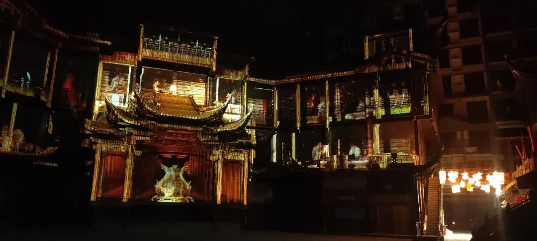 為在此處完美呈現光影秀,在進行設計方案時,項目團隊便依據數據和實地測量,對項目覆蓋面、安裝角度、承重、安裝方式進行了細致分析,針對觀影點位多有成像黑影、舞臺兩側邊角有遮擋、鏤空墻體如何投影等問題給出詳細解決方案,最終讓投影畫面與建筑輪廓完美融合,最大程度展現七十二奇樓的風格迥異之美,讓觀眾宛如進入一個超越三維的世界。