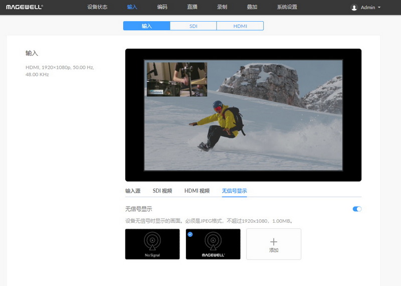 此外,還可設(shè)置當(dāng)Ultra Encode AIO無(wú)信號(hào)接入時(shí)顯示的畫面,可以選“No Signal”或“MAGEWELL”圖標(biāo),還可以選擇自定義圖片。(注:自定義圖片必須是JPEG格式,不超過(guò)1920x1080,1.00MB)