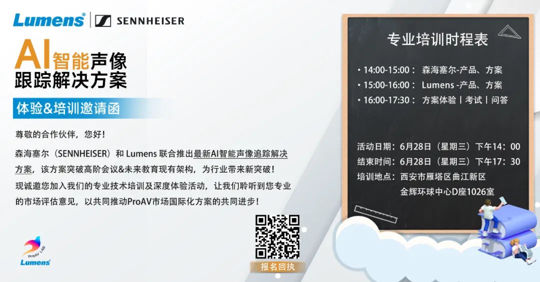 森海塞爾(SENNHEISER)和Lumens聯(lián)合推出最新AI智能聲像追蹤解決方案,該方案突破高階會(huì)議&未來(lái)教育現(xiàn)有架構(gòu),為行業(yè)帶來(lái)新突破!現(xiàn)誠(chéng)邀您加入我們的深度體驗(yàn)活動(dòng),讓我們聆聽(tīng)到您專(zhuān)業(yè)的市場(chǎng)評(píng)估意見(jiàn),以共同推動(dòng)ProAV市場(chǎng)國(guó)際化方案的共同進(jìn)步!6月28日,Lumens聯(lián)合SENNHEISER、陜西索鴻視訊電子科技,在西安舉辦聯(lián)合線下方案體驗(yàn)交流會(huì),歡迎業(yè)內(nèi)朋友報(bào)名參與!