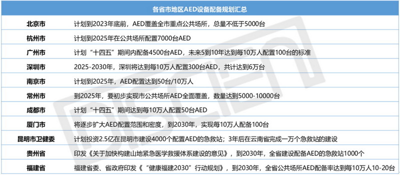 隨著近幾年,《健康中國行動(2019-2030)》、《公共場所自動體外除顫器配置指南(試行)》、《十四五健康老齡化規劃》等國家文件接連要求“在人流密集場所配置AED設備”,各省市迅速響應,迎來了深圳、北京、杭州等10余省市密集下發配置規劃的盛況。