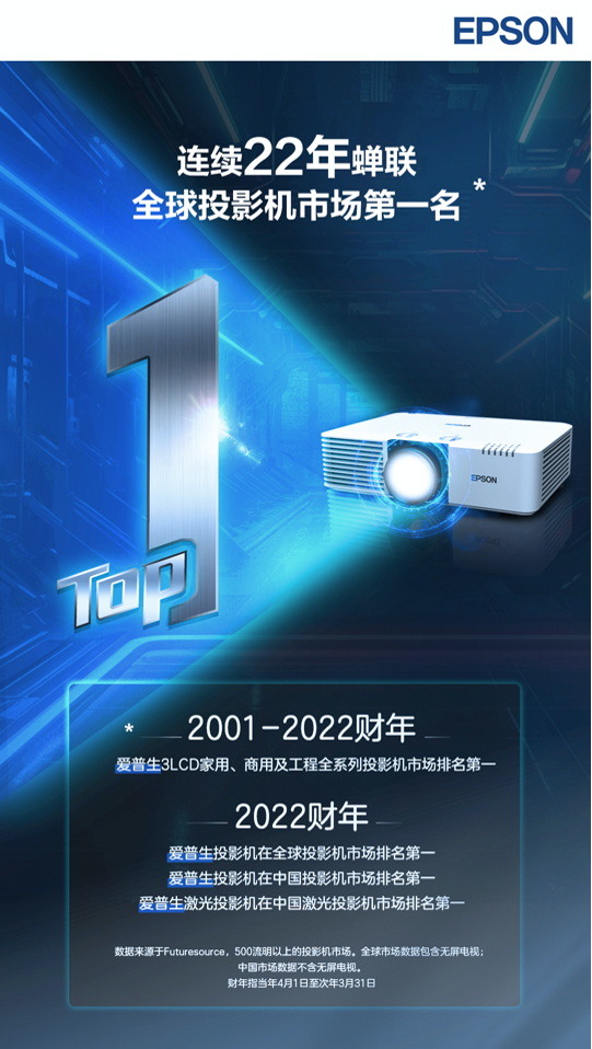 《Futuresource季度市場洞察報告》顯示2001-2022財年,愛普生持續領跑投影市場22年。發揮技術優勢,助力行業創造價值。