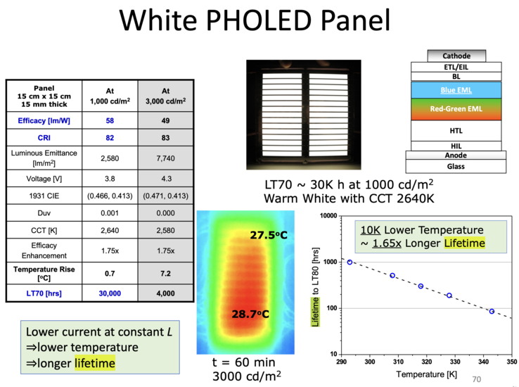 兩位教授表示綠色二極管耐用性最高,而藍色的耐用性最低,如果撇除藍色二極管的影響,OLED 面板的理論壽命為 100 多年,或大約 100 萬小時。