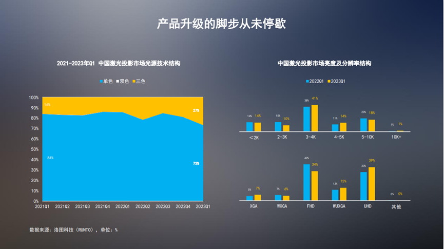 激光顯示產品升級的趨勢從未停歇。投影技術從單色、雙色到三色,2023年第一季度,三色激光技術在市場中的占比已經接近三成。亮度向3-5K流明的中高端遷移,分辨率從2K到4K,8K的激光電視也已經面世。