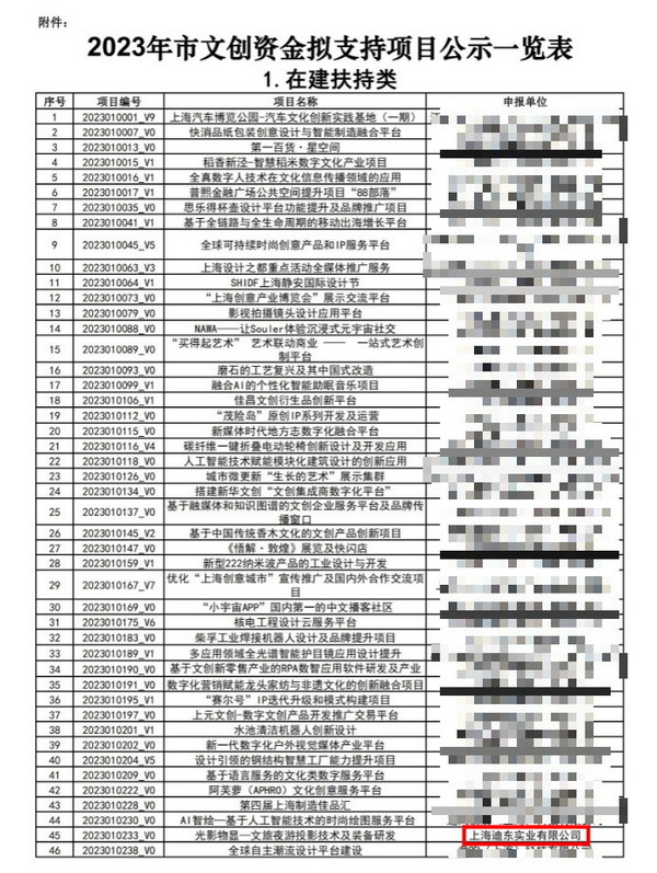 2023年8月9日,上海市文化創意產業推進領導小組辦公室公布了《2023年上海市促進文化創意產業發展財政扶持資金擬支持項目(第一批)公示》,本次以“光影物顯——文旅夜游投影技術及裝備研發”項目榮獲該資金財政扶持的上海迪東實業有限公司是迪恒技術股份有限公司的前身。