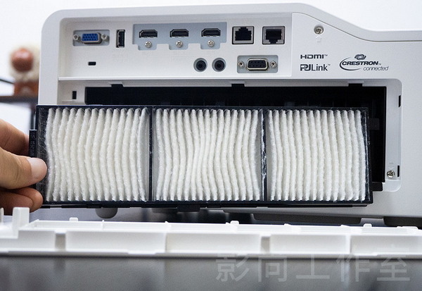 防塵濾網(wǎng)可以輕松拆下進(jìn)行除塵及更換。我們看到濾網(wǎng)非常厚實(shí),杜絕灰塵進(jìn)入機(jī)身內(nèi)部。得益于防塵與散熱表現(xiàn),松下PT-GMZ510C具有低噪音模式,在演講與授課時(shí),運(yùn)行噪音能降至25dB,聽眾完全不會(huì)受到打擾。