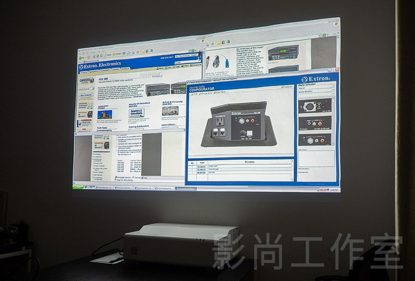 我們?yōu)榱藴y(cè)試色彩效果所以控制了環(huán)境光,投影文檔、網(wǎng)頁或者白色主色調(diào)畫面,感覺有些刺眼,足以證明其在開著燈光或者拉開窗簾的室內(nèi),投影PPT或課件,效果將非常醒目。