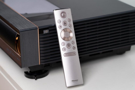 海信激光電視L8K的控制面板非常簡約,僅有一枚電源按鍵,所有播放/暫停、快進/快退、信號源切換等操作都需要借助配套遙控器進行,金屬材質與磨砂質感使得這款遙控器光是拿在手中便是一種享受。