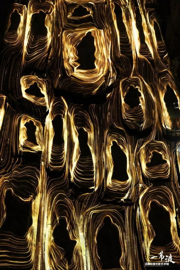繁花似錦的線條通過光影投射在石壁上,每一個符號花紋,都代表了一段故事、一個期望、一個智慧的誕生,此處通過光影呈現(xiàn)效果,增強游客對于知識和想象力的探索。