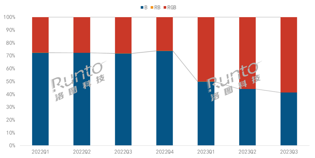 根據洛圖科技(RUNTO)數據顯示,2023年前三季度,中國激光投影市場中三色技術市場份額達到37.6%,較2022年同期大漲20.3個百分點;而在家用市場,三色已經實現了對單色的反超,出貨量占比達到55.3%。