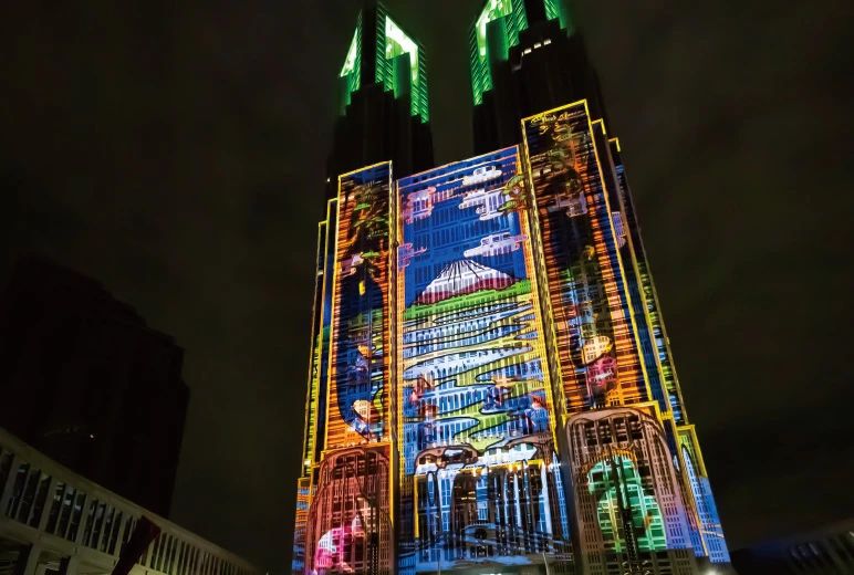 ◎使用松下目前亮度最高的投影機PT-SRQ50KC(中國型號),在東京都廳的外墻上投射出明亮且高分辨率的圖像。