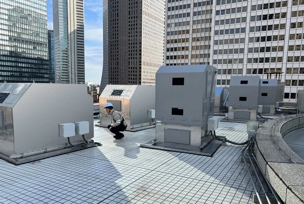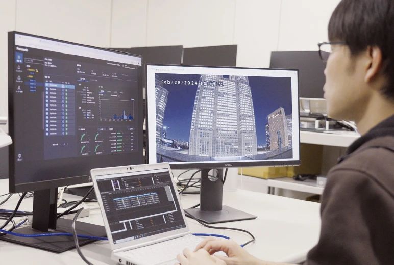 在東京都廳第1本廳舍的13,904.956平方米墻面上進行投影需要40臺投影機。項目之初,我們對墻面及安裝環境進行了全面勘測,隨后基于精確測量結果創建了詳盡的CAD數據。鑒于投影機將部署于屋頂,我們進行了毫米級的精準布局規劃,巧妙避開了太陽能板等既有設施,設定了每臺投影機的最佳投射角度。為確保系統的穩定與耐用,我們特別定制了承重能力強、抗震、防水且防塵的投影機防護箱,這一創新設計不僅保障了投影機的穩定運行,更在長期使用中有效維護了投影畫面的卓越品質。