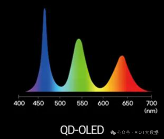 對于顯示屏來說,色彩純度高,色彩確度高,表現也越廣。和下面QD-OLED的光譜一樣,因為像素中并沒有白光發光單元,所以表現出來的顏色不會受白光的影響,顏色之間區分得越清楚,色彩純度就越高。