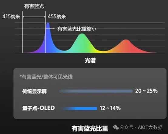 在可見光譜中,藍光區域的415~455nm波段由于波長較短、能量較高,長時間接觸會增加眼部疲勞,抑制褪黑激素的分泌,進而對睡眠質量產生不良影響。而QD-OLED技術則在這一方面展現出了顯著的優勢,其“有害藍光”的比重遠低于普通LCD顯示屏,為用戶帶來了更加健康、舒適的護眼觀看體驗。