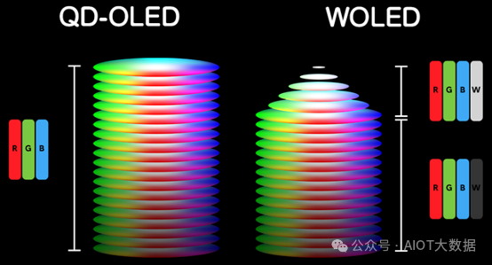 簡而言之,QD-OLED技術主要利用了量子點的兩個關鍵特性:藍色和色域。通過量子點的色彩轉換,提升了顯示亮度并擴大了色域。與WOLED技術相比,QD-OLED的紅色和綠色是通過量子點的色彩轉換得到的,而藍色則是通過量子點本身的藍色實現的。這種設計減少了背光透過彩膜造成的亮度損失,同時量子點激發出的背光具有更廣的色彩空間,進一步提升了顯示器的色域。