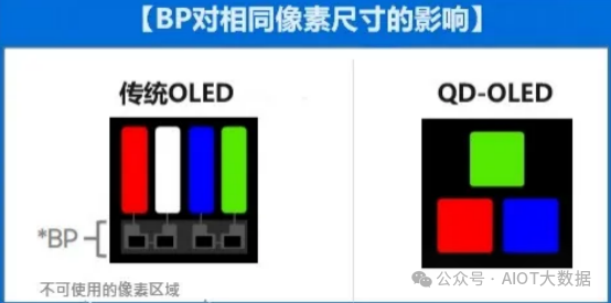 相比之下,QD-OLED的“頂發光式”結構則展現出了顯著的優勢。在這種結構中,發光層位于背板的上方,因此沒有遮擋光的區域。即使像素尺寸減小,也不會受到背板(BP)的影響,從而能夠保持較高的亮度水平。這一特點使得QD-OLED在高分辨率顯示領域具有更大的潛力。