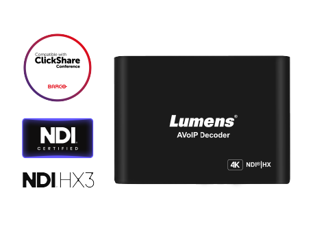 Lumens AVoIP解碼器OIP-N60D已獲得Barco ClickShare認(rèn)證。這款NDI HX 4K解碼器具有卓越的解碼能力,能夠在網(wǎng)絡(luò)上解碼HD和4K的IP和NDI信號,并能透過USB同步輸出UVC和UAC的影音串流。透過此次與ClickShare的合作,客戶可以利用專業(yè)級IP攝像機(jī)來實(shí)現(xiàn)真正高效的協(xié)作會議。OIP-N60D解碼器還可以與OIP-N40E編碼器搭配使用,作為USB延伸器,它們能夠透過IP網(wǎng)絡(luò)來傳輸?shù)脱舆t的USB視訊和音頻,并直接輸出到ClickShare。
