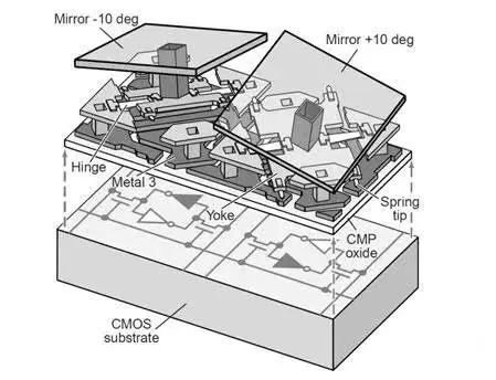為什么HEP800機(jī)型的對(duì)比度能有這么大幅度的提升呢?首先HEP封裝DMD微鏡的偏轉(zhuǎn)角度加大,導(dǎo)致反射的OFF光更加遠(yuǎn)離投影機(jī)鏡頭,從而大幅減少了OFF光經(jīng)光機(jī)吸光部件反射的雜散光通過鏡頭溢出的比例,也就大幅減少了暗場亮度。